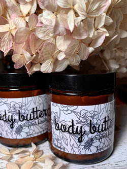 Whipped luxury in a jar defines our body butter formulation. Our recipe calls for all natural ingredients of raw shea butter, grape seed oil, vitamin e, aloe gel, arrow root and essential oils that will not only soak into your skin but simultaneously moisturize, nurture and protect your skin. The best time to apply is immediately following a shower or bath when your skin is still lightly damp. A small amount of this decadent thick butter goes a long way so be careful not to use too much or your skin could become greasy. Gentle enough for daily all over body use and particularly helpful for dry rough patches on your feet, elbows, knees, dry palms, cuticles and even lips.